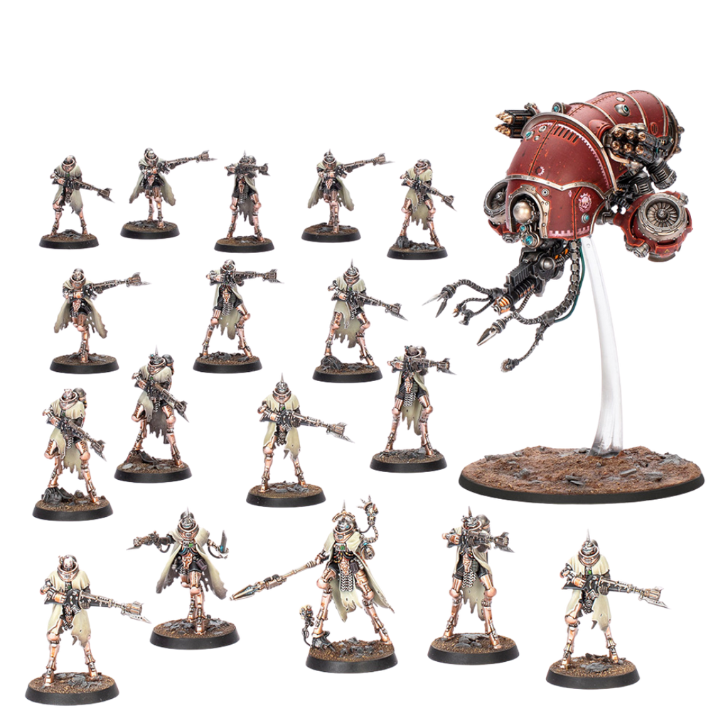 Möchtest du im Namen des Omnissiah – unabhängig davon, wie du seine wahre Natur interpretierst – die Galaxis erobern, bietet dieses Set einen idealen Einstieg in das Mechanicum oder eine lohnende Erweiterung deiner bestehenden Armee. Gegenüber dem Einzelkauf der enthaltenen Bausätze sparst du zudem bares Geld. Das Herzstück der Streitmacht bilden mobile Skitarii-Kriegspilger, die mit mächtigen Voltschuss-Arkebusen ausgerüstet sind und dank ihrer Beinimplantate außergewöhnliche Beweglichkeit zeigen. Angeführt werden sie von einem erfahrenen Skitarii-Kriegspilger-Marschall mit spezialisierter Ausrüstung, während ein fliegender Vultarax-Stratos-Automaton zusätzliche Feuerkraft und Unterstützung liefert. Diese erstmals erhältliche Kampfgruppe ist bestens gerüstet, um sich jedem Gegner entgegenzustellen.